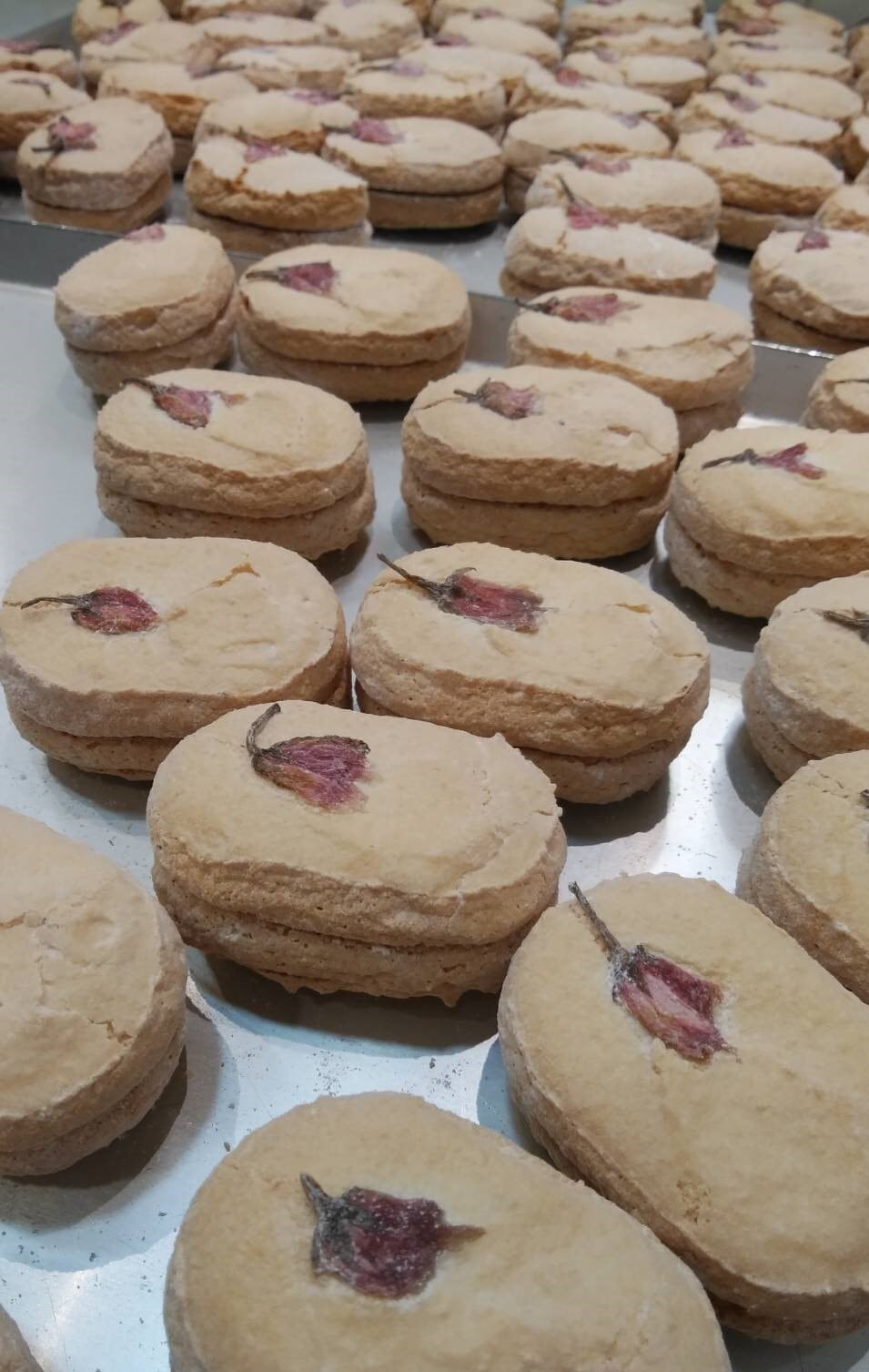 ふんわりダコワーズにグリオット(さくらんぼ)を煮詰めた果汁を加えた桜風味のバタークリーム、とグリオットを刻み、挟みました。香料を加えただけの桜クリームとは別物です。本物の桜クリームの風味を味わってください!