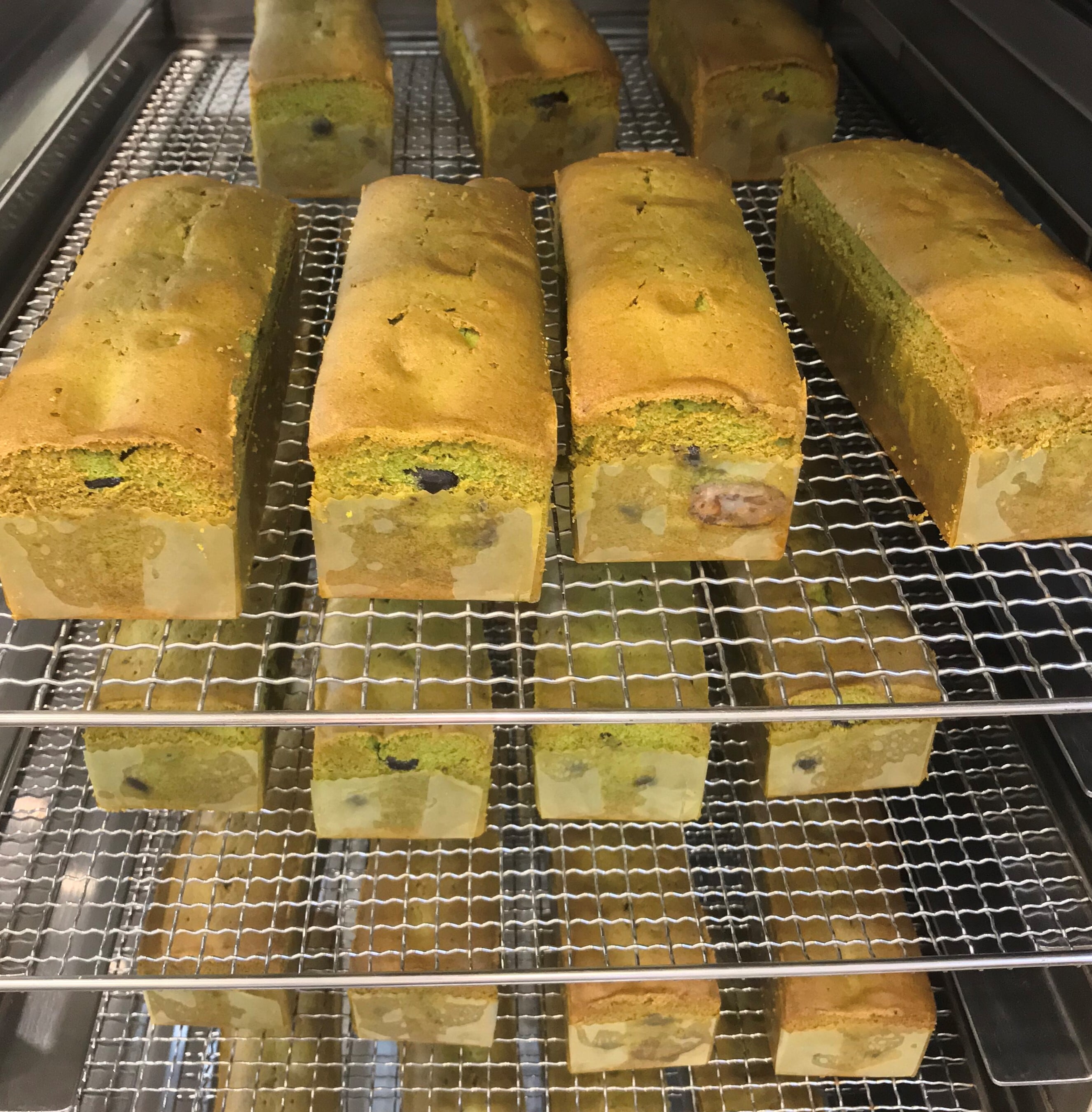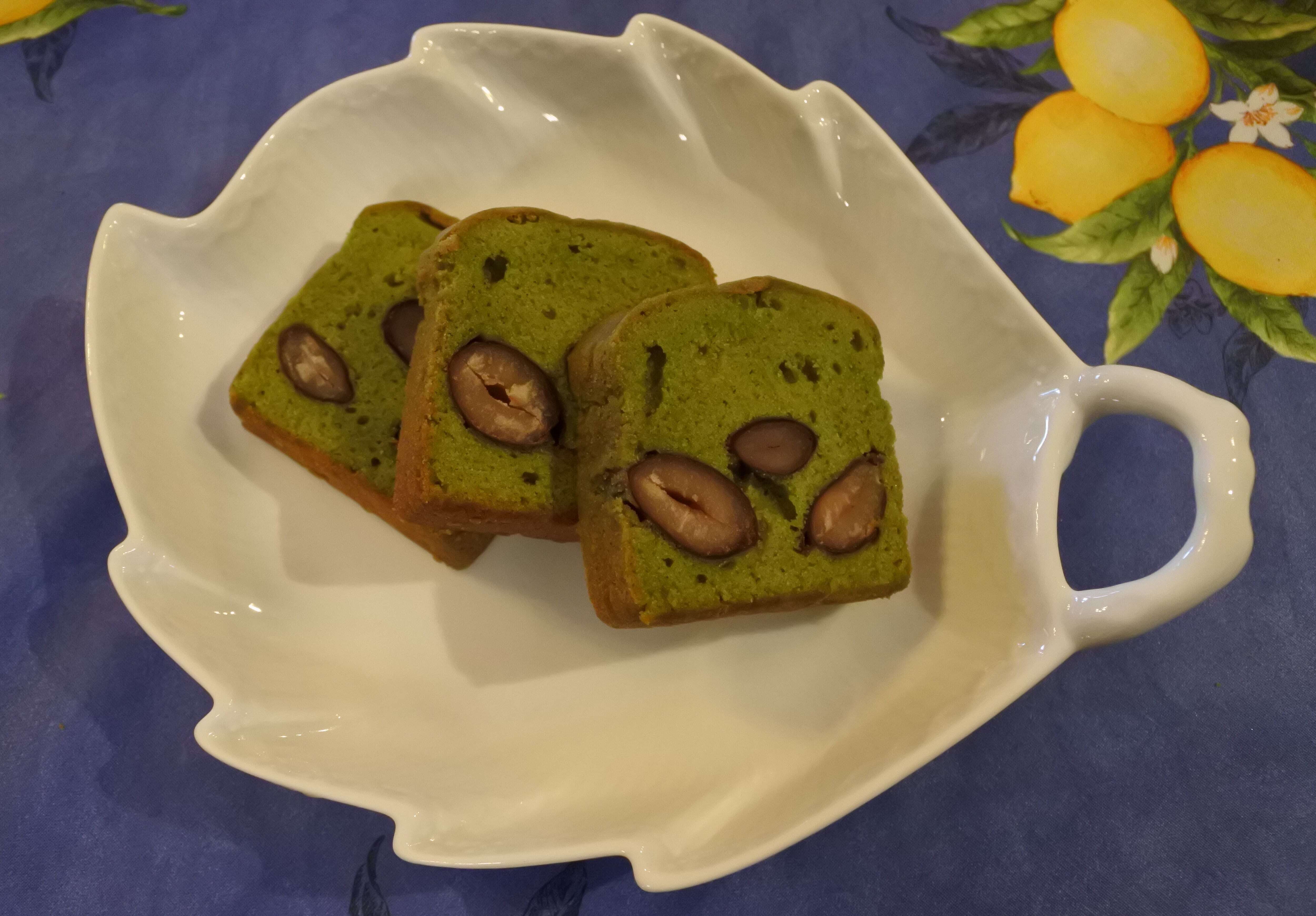 濃い抹茶のバターたぅぷりの、しっとり生地のパウンドケーキにたっぷり入れて焼き上げた、